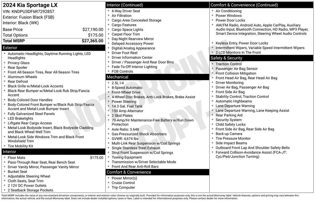We are a family owned and operated business. We look forward to serving all your automotive needs, sales, service, parts, and body shop. When it comes to your automotive needs, Commerce Chevrolet has you covered. Contact us today! 903-886-2188.This 2024 Kia Sportage LX I4 8-Speed Automatic FWD in Fusion Black comes with the following features: 17 Alloy Wheels, 4-Wheel Disc Brakes, 6 Speakers, ABS brakes, Air Conditioning, Alloy wheels, AM/FM radio, Auto High-beam Headlights, Axle Ratio: 3.648, Brake assist, Bumpers: body-color, Carpeted Floor Mats, Cloth Seat Trim, Delay-off headlights, Driver door bin, Driver vanity mirror, Dual front impact airbags, Dual front side impact airbags, Electronic Stability Control, Four wheel independent suspension, Front anti-roll bar, Front Bucket Seats, Front Center Armrest, Fully automatic headlights, Illuminated entry, Low tire pressure warning, Occupant sensing airbag, Outside temperature display, Overhead airbag, Overhead console, Panic alarm, Passenger door bin, Passenger vanity mirror, Power door mirrors, Power steering, Power windows, Radio: AM/FM/HD Audio System, Rear anti-roll bar, Rear seat center armrest, Rear side impact airbag, Rear window defroster, Rear window wiper, Remote keyless entry, Security system, Speed control, Speed-sensing steering, Split folding rear seat, Spoiler, Steering wheel mounted audio controls, Tachometer, Telescoping steering wheel, Tilt steering wheel, Traction control, Trip computer, and Variably intermittent wipers.