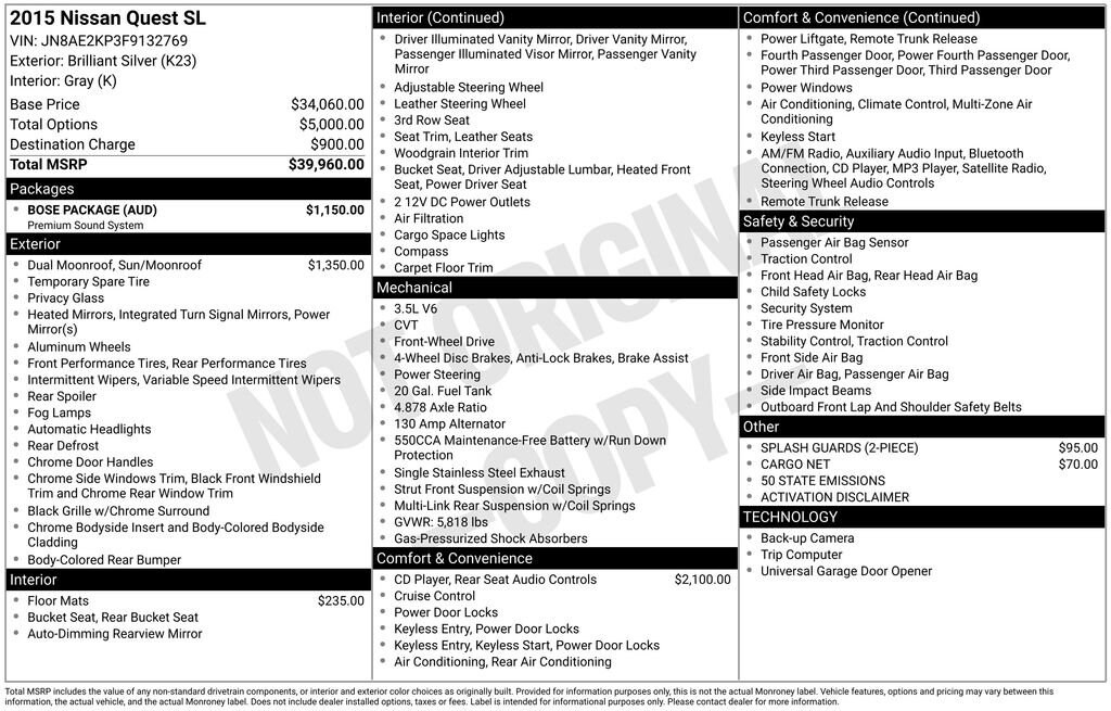 We are a family owned and operated business. We look forward to serving all your automotive needs, sales, service, parts, and body shop. When it comes to your automotive needs, Commerce Chevrolet has you covered. Contact us today! 903-886-2188.This 2015 Nissan Quest 3.5 SL 3.5L 6-Cylinder DOHC CVT with Xtronic FWD in Brilliant Silver comes with the following features: 18 x 7 Alloy Wheels, 3rd row seats: split-bench, 4-Wheel Disc Brakes, 4.878 Axle Ratio, ABS brakes, Activation Disclaimer, Air Conditioning, Alloy wheels, AM/FM radio: SiriusXM, Anti-whiplash front head restraints, Auto-dimming Rear-View mirror, Automatic temperature control, Brake assist, Bumpers: body-color, Cargo Net, Carpeted Floor Mats 1st/2nd/3rd Rows, CD player, Delay-off headlights, Driver door bin, Driver vanity mirror, Driver's Seat Mounted Armrest, Dual front impact airbags, Dual front side impact airbags, Electronic Stability Control, Four wheel independent suspension, Front anti-roll bar, Front Bucket Seats, Front dual zone A/C, Front fog lights, Front reading lights, Garage door transmitter: HomeLink, Heated door mirrors, Heated front seats, Illuminated entry, Leather Appointed Seat Trim, Leather Shift Knob, Leather steering wheel, Low tire pressure warning, Occupant sensing airbag, Outside temperature display, Overhead airbag, Overhead console, Panic alarm, Passenger door bin, Passenger seat mounted armrest, Passenger vanity mirror, Power door mirrors, Power driver seat, Power Liftgate, Power steering, Power windows, Quick Comfort Heated Front Bucket Seats, Radio data system, Rear air conditioning, Rear reading lights, Rear window defroster, Rear window wiper, Reclining 3rd row seat, Remote keyless entry, Roof rack: rails only, Security system, Speed control, Speed-sensing steering, Speed-Sensitive Wipers, Splash Guards (2-Piece), Split folding rear seat, Spoiler, Steering wheel mounted audio controls, Tachometer, Telescoping steering wheel, Tilt steering wheel, Traction control, Trip computer, Turn signal indicator mirrors, and Variably intermittent wipers.
