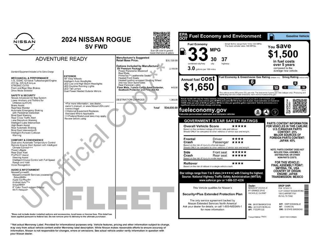 This 2024 Nissan Rogue SV 1.5L DOHC CVT with Xtronic FWD in Deep Ocean Blue Pearl comes with the following features: SV Premium Package (Heated Front Seats, Heated Leather-Wrapped Steering Wheel, Leatherette Door Trim Inserts w/Stitch, Panoramic Moonroof, Prima-Tex Leatherette Seat Trim w/Perforation, Rear Door Sunshades, Rear Personal Lights, and Silver Painted Roof Rails), 4-Wheel Disc Brakes, 5.676 Axle Ratio, 6 Speakers, ABS brakes, Air Conditioning, Alloy wheels, AM/FM radio: SiriusXM, Auto High-beam Headlights, Automatic temperature control, Brake assist, Bumpers: body-color, Cloth Seat Trim w/Patterned Inserts, Delay-off headlights, Driver door bin, Driver vanity mirror, Dual front impact airbags, Dual front side impact airbags, Electronic Stability Control, Emergency communication system: NissanConnect Services, First Aid Kit, Floor Mats w/1-Piece Cargo Area Protector, Four wheel independent suspension, Front anti-roll bar, Front Bucket Seats, Front Center Armrest, Front dual zone A/C, Front reading lights, Fully automatic headlights, Heated door mirrors, Illuminated entry, Knee airbag, Low tire pressure warning, NissanConnect featuring Apple CarPlay and Android Auto, Occupant sensing airbag, Outside temperature display, Overhead airbag, Overhead console, Panic alarm, Passenger door bin, Passenger vanity mirror, Power door mirrors, Power driver seat, Power Liftgate, Power steering, Power windows, Radio data system, Radio: AM/FM NissanConnect, Rear anti-roll bar, Rear Parking Sensors, Rear seat center armrest, Rear side impact airbag, Rear window defroster, Rear window wiper, Remote keyless entry, Speed control, Speed-Sensitive Wipers, Split folding rear seat, Spoiler, Steering wheel mounted audio controls, Tachometer, Telescoping steering wheel, Tilt steering wheel, Traction control, Trip computer, Variably intermittent wipers, and Wheels: 18 Dark Painted Machine Finished Alloy.