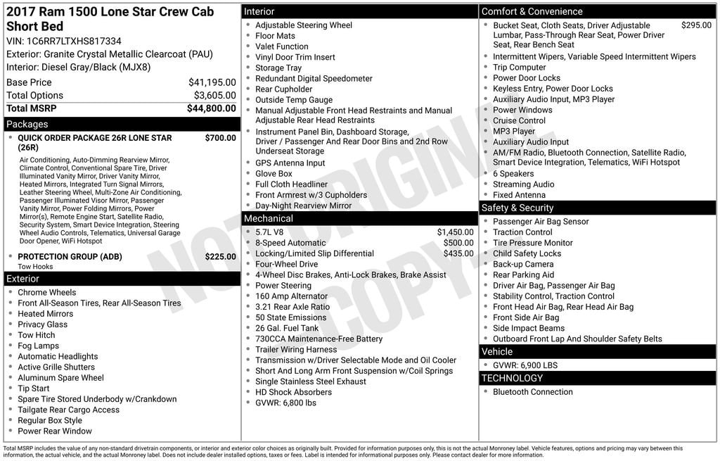 This 2017 Ram 1500 Lone Star HEMI 5.7L V8 Multi Displacement VVT 8-Speed Automatic 4WD in Granite Crystal Metallic Clearcoat comes with the following features: **CARFAX REPORT** Lone Star Regional Package, Protection Group (Tow Hooks), and Quick Order Package 26R Lone Star (Regional) (Air Conditioning ATC w/Dual Zone Control, Auto-Dimming Exterior Mirrors, Auto-Dimming Rear-View Mirror, Bright/Bright Billets Grille, Class IV Receiver Hitch, Dual Rear Exhaust w/Bright Tips, Electric Shift-On-Demand Transfer Case, Electroluminescent Instrument Cluster, Exterior Mirrors Courtesy Lamps, Exterior Mirrors w/Supplemental Signals, Fog Lamps, Glove Box Lamp, Leather Wrapped Steering Wheel, LED Bed Lighting, Lone Star Badge, Overhead Console w/Garage Door Opener, ParkSense Front/Rear Park Assist System, ParkView Rear Back-Up Camera, Power Heated Fold-Away Mirrors, Power-Folding Mirrors, Premium Cloth 40/20/40 Bench Seat, Radio: Uconnect 3C w/8.4 Display, Rear Dome w/On/Off Switch Lamp, Remote Start System, Security Alarm, Steering Wheel Mounted Audio Controls, Sun Visors w/Illuminated Vanity Mirrors, Underhood Lamp, and Wheels: 20 x 8 Aluminum Chrome Clad) Lone Star Regional Package, Protection Group (Tow Hooks), Quick Order Package 26R Lone Star (Regional) (Air Conditioning ATC w/Dual Zone Control, Auto-Dimming Exterior Mirrors, Auto-Dimming Rear-View Mirror, Bright/Bright Billets Grille, Class IV Receiver Hitch, Dual Rear Exhaust w/Bright Tips, Electric Shift-On-Demand Transfer Case, Electroluminescent Instrument Cluster, Exterior Mirrors Courtesy Lamps, Exterior Mirrors w/Supplemental Signals, Fog Lamps, Glove Box Lamp, Leather Wrapped Steering Wheel, LED Bed Lighting, Lone Star Badge, Overhead Console w/Garage Door Opener, ParkSense Front/Rear Park Assist System, ParkView Rear Back-Up Camera, Power Heated Fold-Away Mirrors, Power-Folding Mirrors, Premium Cloth 40/20/40 Bench Seat, Radio: Uconnect 3C w/8.4 Display, Rear Dome w/On/Off Switch Lamp, Remote Start System, Security Alarm, Steering Wheel Mounted Audio Controls, Sun Visors w/Illuminated Vanity Mirrors, Underhood Lamp, Wheels: 20 x 8 Aluminum Chrome Clad, 115V Auxiliary Power Outlet, 40/20/40 Split Bench Seat, 6 Month Trial (Reg. Required), 6 Month Trial (Registration Required), 8.4 Touchscreen Display, Audio Jack Input for Mobile Devices, Charge Only Remote USB Port, Folding Flat Load Floor Storage, For Details Visit DriveUconnect.com, Front Armrest w/3 Cupholders, Front Center Seat Cushion Storage, GPS Antenna Input, Integrated Voice Command w/Bluetooth, Media Hub (USB, AUX), Nav-Capable! See Dealer for Details, Power 10-Way Driver Seat, Power Lumbar Adjust, Rear 60/40 Split Folding Seat, Remote USB Port, SIRIUSXM Satellite Radio, Storage Tray, Uconnect Access, and Universal Garage Door Opener), 17 x 7 Aluminum Wheels, 3.21 Rear Axle Ratio, 4-Wheel Disc Brakes, 6 Speakers, ABS brakes, Active Grille Shutters, Air Conditioning, Alloy wheels, AM/FM radio, Anti-Spin Differential Rear Axle, Black Exterior Mirrors, Black Rotary Shifter, Brake assist, Bumpers: chrome, Center Hub, Cloth 40/20/40 Bench Seat, Compass, Delay-off headlights, Driver door bin, Dual front impact airbags, Dual front side impact airbags, Electronic Shift, Electronic Stability Control, Exterior Mirrors w/Heating Element, Front anti-roll bar, Front Center Armrest w/Storage, Front reading lights, Front wheel independent suspension, Fully automatic headlights, Heated door mirrors, Illuminated entry, Low tire pressure warning, Occupant sensing airbag, Outside temperature display, Overhead airbag, Overhead console, Panic alarm, Passenger door bin, Passenger vanity mirror, Power door mirrors, Power steering, Power win