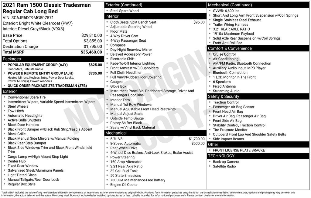 At BravoBudget, we're committed to providing our customers with the best possible vehicle buying experience. Our team of knowledgeable and friendly sales professionals is here to guide you through the process and ensure you find the perfect truck to meet your needs. Visit us today and let us show you why the 2021 Ram 1500 Classic Tradesman should be your next vehicle.