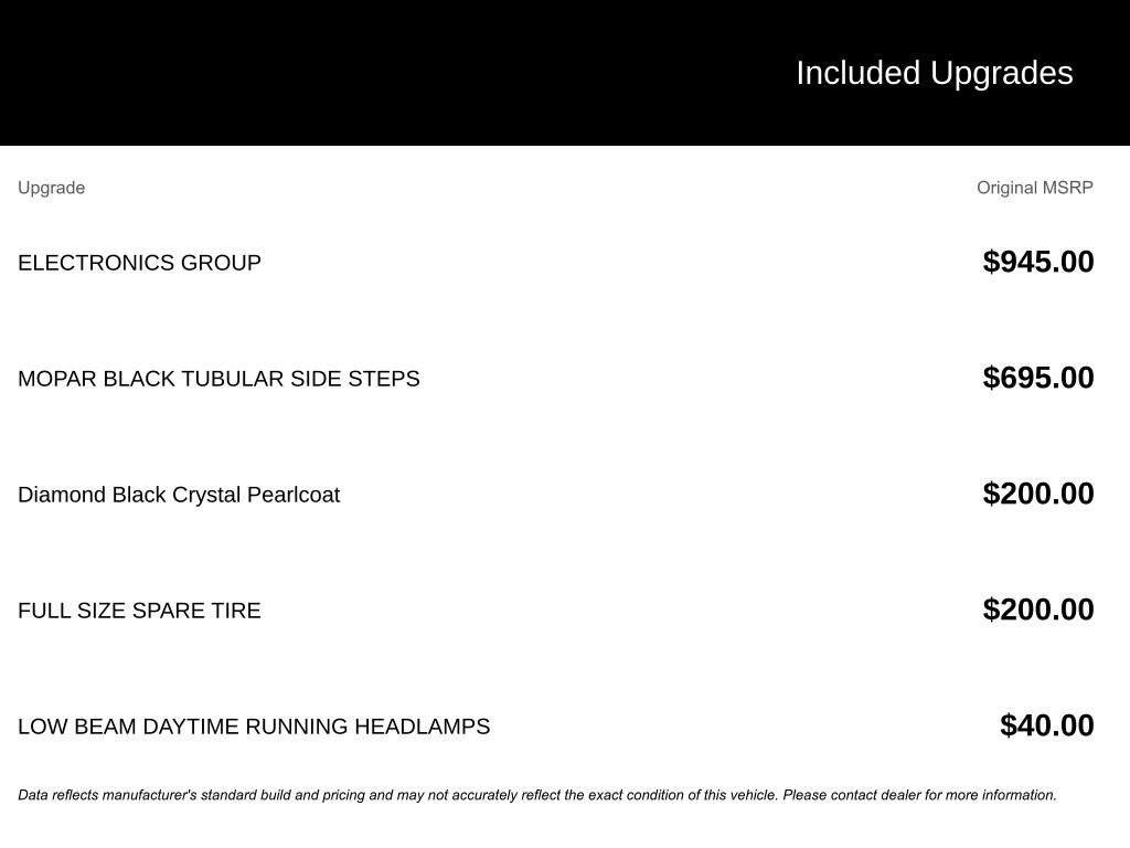 This Warlock edition sets itself apart with its striking Black exterior and a host of premium features. Enjoy the convenience of the Electronics Group, which includes Google Android Auto, USB connectivity, and a premium Uconnect infotainment system with an 8.4 touchscreen display. Stay connected on the go with the built-in 4G LTE Wi-Fi hotspot and SiriusXM Guardian services.