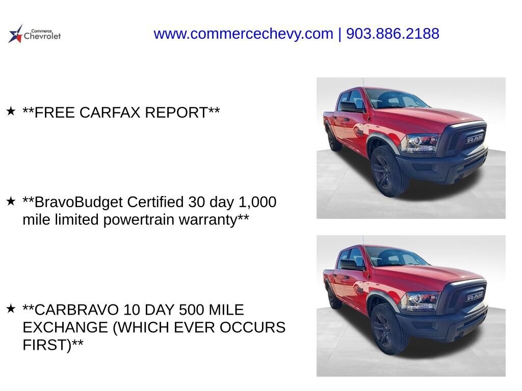 Discover the ultimate in rugged capability and uncompromising style with the 2024 Ram 1500 Classic Warlock. This exceptional truck is more than just a workhorse; it's a true statement of confidence and capability on the road. FREE CARFAX REPORT BravoBudget Certified 30 day 1,000 mile limited powertrain warranty CARBRAVO 10 DAY 500 MILE EXCHANGE (WHICH EVER OCCURS FIRST)Boasting a powerful 3.6L V6 24V VVT engine paired with an 8-Speed Automatic transmission and 4WD, the Warlock delivers impressive performance and efficiency, with an EPA-estimated 16 city/23 highway MPG. Its rugged design and raised ride height command attention, while the bold black accents and 20 high-gloss black aluminum wheels exude an undeniable sense of style.Inside, the Warlock offers a well-appointed cabin with premium features like the Uconnect 3 infotainment system with a 5 display, 6 speakers, and integrated voice command with Bluetooth. The 40/20/40 split bench seat in durable cloth upholstery provides comfortable seating for up to six passengers, and the front center armrest with storage keeps your essentials within reach.Safety and convenience are also priorities, with features like the ParkSense Rear Park Assist System, ParkView Rear Back-Up Camera, and electronic stability control ensuring a confident and secure driving experience. The Warlock also boasts a range of advanced driver-assist technologies, including automatic headlights, speed control, and a tire pressure monitoring system.Whether you're tackling tough terrain or navigating the daily commute, the 2024 Ram 1500 Classic Warlock is the perfect companion. Its blend of rugged capability, premium features, and head-turning style make it a standout choice in the full-size truck segment.Experience the power and presence of the Warlock for yourself. Visit our showroom today and let us demonstrate how this exceptional truck can elevate your driving experience.