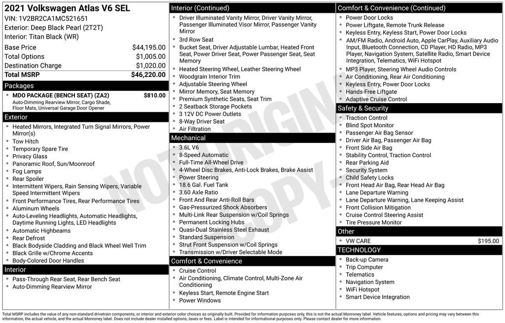 MDO PACKAGE (BENCH SEAT) - Includes Privacy Cover, retractable privacy cover for cargo area, Frameless Self-Dimming Rearview Mirror, compass and HomeLink garage door opener, Rubber Mats Kit - Bench Seat, Monster Mats w/logo for 2nd-row (set of 5), Heavy Duty Trunk Liner w/VW CarGo Blocks
