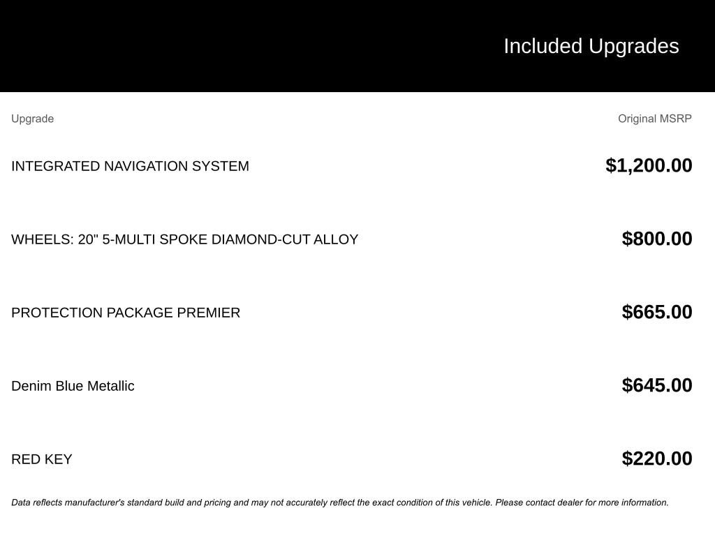 - Wheels : 20 x 9-inch front and rear machined w/painted accents aluminum wheels