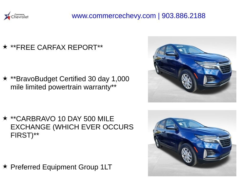 This 2023 Chevrolet Equinox LT 1.5L DOHC 6-Speed Automatic Electronic with Overdrive FWD in Blue Glow Metallic comes with the following features: **FREE CARFAX REPORT**, **BravoBudget Certified 30 day 1,000 mile limited powertrain warranty**, and **CARBRAVO 10 DAY 500 MILE EXCHANGE (WHICH EVER OCCURS FIRST)** Preferred Equipment Group 1LT Preferred Equipment Group 1LT, 17 Aluminum Wheels, 2 Rear USB Charging-Only Ports, 2 USB Ports & Auxiliary Input Jack, 2-Way Power Driver Lumbar Control Seat Adjuster, 3.50 Final Drive Axle Ratio, 4-Wheel Disc Brakes, 6 Speakers, 6-Speaker Audio System Feature, ABS brakes, Air Conditioning, Alloy wheels, AM/FM radio: SiriusXM, Auto High-beam Headlights, Bluetooth® For Phone, Brake assist, Bumpers: body-color, Compass, Delay-off headlights, Deleted 3 Years of Remote Access, Driver 8-Way Power Seat Adjuster, Driver door bin, Driver vanity mirror, Dual front impact airbags, Dual front side impact airbags, Electronic Stability Control, Emergency communication system: OnStar and Chevrolet connected services capable, Four wheel independent suspension, Front anti-roll bar, Front Bucket Seats, Front Center Armrest, Front Passenger 4-Way Manual Seat Adjuster, Front reading lights, Fully automatic headlights, Heated door mirrors, Illuminated entry, Low tire pressure warning, Occupant sensing airbag, Outside temperature display, Overhead airbag, Overhead console, Panic alarm, Passenger door bin, Passenger vanity mirror, Power door mirrors, Power driver seat, Power steering, Power windows, Premium audio system: Chevrolet Infotainment 3, Premium Cloth Seat Trim, Radio data system, Radio: Chevrolet Infotainment 3 System w/AM/FM, Rear anti-roll bar, Rear reading lights, Rear seat center armrest, Rear window defroster, Rear window wiper, Remote keyless entry, Security system, SiriusXM Radio, Speed control, Speed-sensing steering, Split folding rear seat, Spoiler, Steering wheel mounted audio controls, Tachometer, Telescoping steering wheel, Tilt steering wheel, Traction control, Trip computer, Variably intermittent wipers, and Wireless Apple CarPlay/Wireless Android Auto.