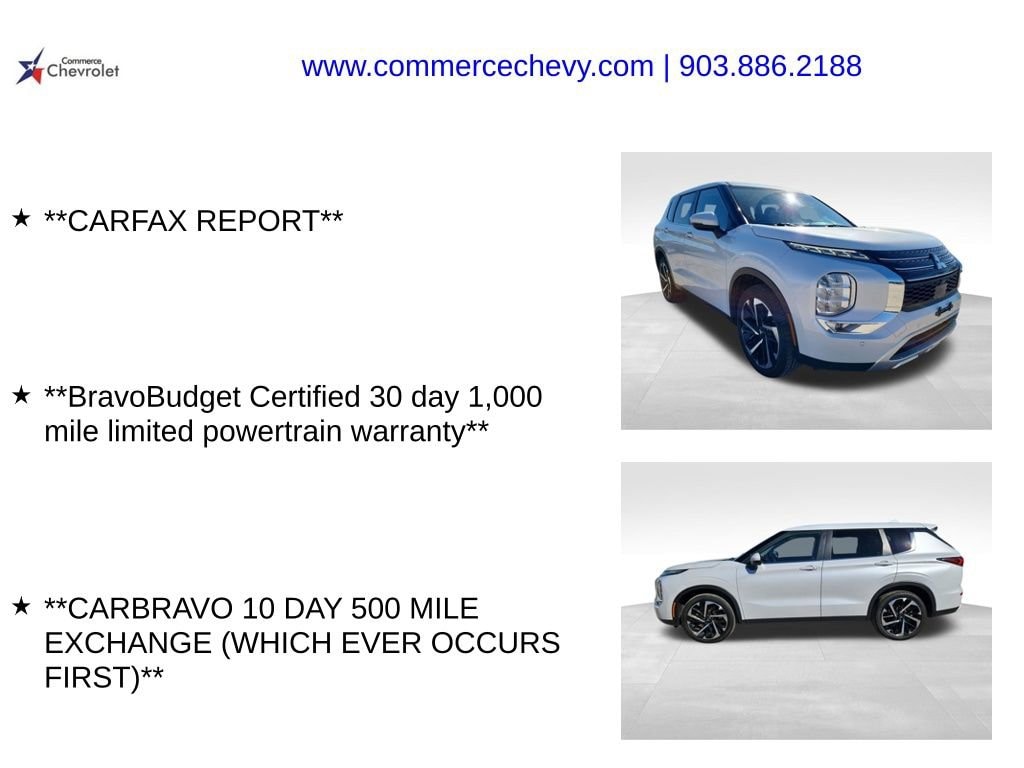 Priced below KBB Fair Purchase Price! CARFAX One-Owner. We are a family owned and operated business. We look forward to serving all your automotive needs, sales, service, parts, and body shop. When it comes to your automotive needs, Commerce Chevrolet has you covered. Contact us today! 903-886-2188.This 2024 Mitsubishi Outlander SE Black Edition w/Pano Roof 2.5L 4-Cylinder DOHC CVT FWD in Blue comes with the following features: **FREE CARFAX REPORT**, **BravoBudget Certified 30 day 1,000 mile limited powertrain warranty**, and **CARBRAVO 10 DAY 500 MILE EXCHANGE (WHICH EVER OCCURS FIRST)** 3rd row seats: split-bench, 4-Wheel Disc Brakes, 5.694 Axle Ratio, 6 Speakers, ABS brakes, Air Conditioning, Alloy wheels, AM/FM radio: SiriusXM, Android Auto & Apple CarPlay, Auto High-beam Headlights, Automatic temperature control, Brake assist, Bumpers: body-color, Driver door bin, Driver vanity mirror, Dual front impact airbags, Dual front side impact airbags, Electronic Stability Control, Emergency communication system: Mitsubishi Connect w/ 24-month trial, Exterior Parking Camera Rear, Four wheel independent suspension, Front anti-roll bar, Front Bucket Seats, Front Center Armrest w/Storage, Front dual zone A/C, Front fog lights, Front reading lights, Fully automatic headlights, Heated door mirrors, Heated Front Bucket Seats, Heated front seats, Illuminated entry, Knee airbag, Leather Shift Knob, Leather steering wheel, Low tire pressure warning, Navigation System, Occupant sensing airbag, Outside temperature display, Overhead airbag, Overhead console, Panic alarm, Passenger door bin, Passenger vanity mirror, Power door mirrors, Power driver seat, Power Liftgate, Power steering, Power windows, Radio data system, Radio: AM/FM 9.0 Navigation w/Smartphone Link, Rain sensing wipers, Rear anti-roll bar, Rear seat center armrest, Rear side impact airbag, Rear window defroster, Rear window wiper, Reclining 3rd row seat, Remote keyless entry, Security system, Speed control, Speed-Sensitive Wipers, Split folding rear seat, Spoiler, Steering wheel mounted audio controls, Synthetic Leather Seat Trim, Tachometer, Telescoping steering wheel, Tilt steering wheel, Traction control, Trip computer, Turn signal indicator mirrors, and Variably intermittent wipers.